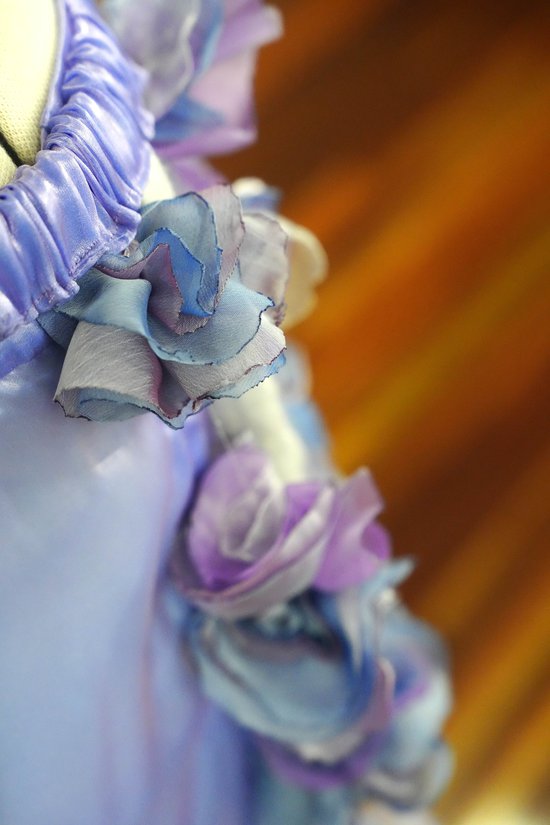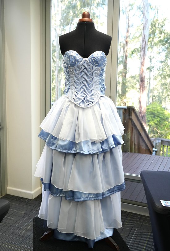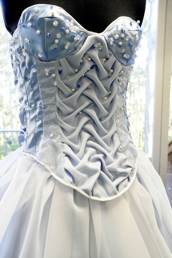 This is a two-piece garment with a distinctive blue monochromatic colour palette. It is a full length, three tiered levelled, gathered skirt and a structured, decorative boned corset, designed as an outer garment. The design is constructed with satin fabric and overlays of sheer chiffon and boucle netted sheer fabric. The corset features graduated beading, scattered with blue, clear crystal and pearl beads. The beading is scattered from the centre of the cups and at the top of the panels to the bottom edge of the bodice, giving tactile and visual texture. Various Pannels on the corset consist of different ripple and wave smocking techniques. The fabric is manipulated to give the fabric a sense of movement by mimicking flow properties of water and the sheer overlay gives elegance to the garment. The corset is also embedded with floral machine embroidery, adding an element of intricate detail to the garment. The panels on the edge of the corset have ten eyelets on each panel and is fastened with a white ribbon tie. The bodice edges are finished with a white bias tape to enclose all the raw seam finishes of the garment. The skirt is designed with blue satin lining and the layers consist of blue fabric overlayed with sheer. The inclusion of an invisible zipper allows the garment to be taken on and off.