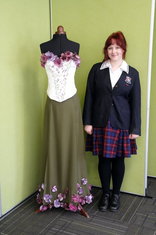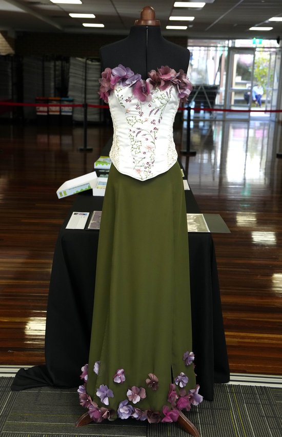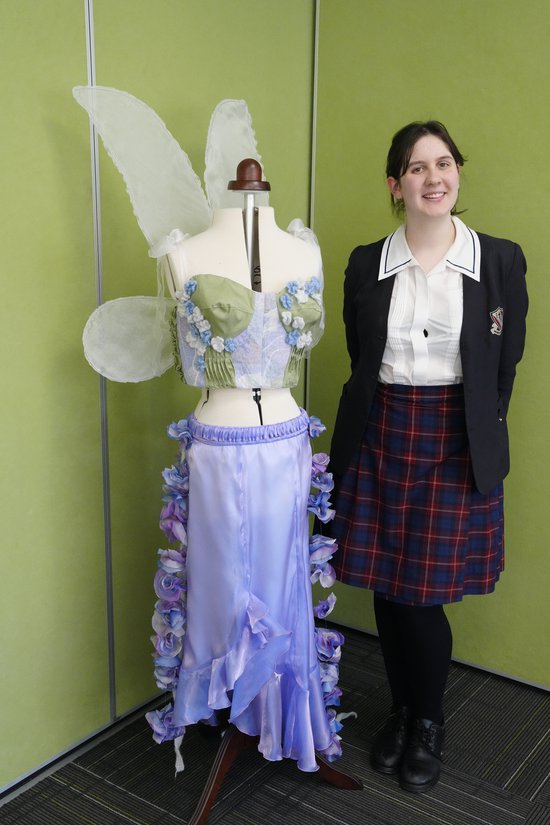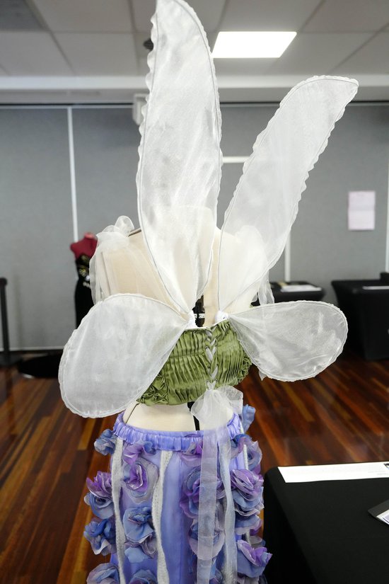 My Major Project is a four piece fairy costume set, comprising a corset top, skirt, elastic waist belt and wings. The corset top laces up at the back and has boning in each vertical seam. It has panels with reverse pleating, make your own fabric and flower smocking, as well as crochet flowers on the cups and tie up straps for the shoulder straps. The skirt has a knee-high slit up the side with a ruffle going along the hem and the edge of the slit. The skirt has an invisible zipper to allow for it to be easily put on. Construction techniques include french seams and a rolled hem on the ruffle. The elastic waist belt sits over the skirt and the chains of 3D flowers and crochet spirals are attached to this belt, so they fall down the back of the skirt. The wings are attached together and sit behind the corset top to hold the wings in place. The costume was inspired by Claude Monet paintings, Greek goddesses clothing, and the flower fairy books by Cicely Mary Barker. These inspirations help to give the costume very whimsical, and fanciful aesthetic.