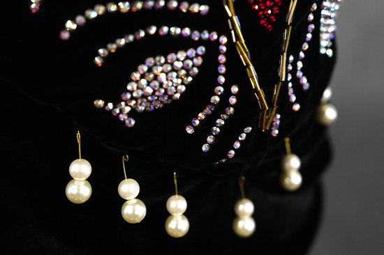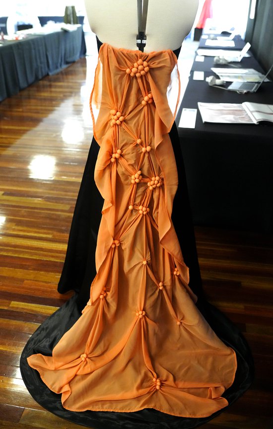 I inserted leaf smocking pieces using reverse applique and traced the boarder of the smocking with a satin stitch to reflect the uneven texture of lava. Additionally, I dyed a white piece of chiffon to create a lava colour and attached it to the back of the dress to convey the uncontrolled flow of lava down a volcano. I used a marble steaming technique on the fabric to form bubble shapes as seen in lava and secured these shapes with cotton balls. Red and orange beads, inspired by Indian jewellery are clustered along the neckline and gradate down the bodice. The red beads are symbolic of the Kshatriyas class which is the second highest class in the Indian class system, reflecting love and purity. Finally, the overall shape of the dress is fitted to the body then drapes out to a long train, to accentuate the natural hourglass shape of the body as did 1920’s wedding dresses.