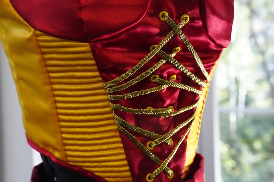 My Major Project is a two piece theatrical dance costume inspired by cancan dresses, the contemporary work of designer Marina Eerrie and elements from the Indian culture. The costume features a corset and a skirt, both in red and gold, reflecting the symbolic colours of the goddess Durga. The corset uses construction techniques and design details like cording and fan lacing, influenced by Marina Eerrie’s designs. To enhance security and support, the corset has a thick strap over one shoulder and a chiffon sari-inspired design on the other, blending Indian cultural elements.