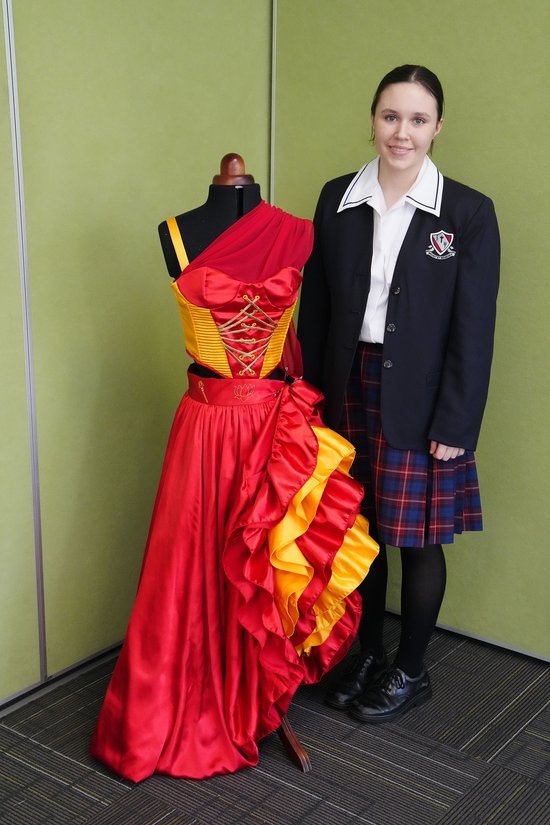 The skirt, inspired by traditional cancan dresses, includes a gathered petticoat with five layers of contrasting ruffles in red and gold. A gathered overlay skirt adds volume and movement, reflecting the dynamic nature of the cancan dance. Durga’s weapons are embroidered on the waistband, symbolizing feminine empowerment. The entire costume is designed to be both visually striking and comfortable, embodying the overall theme of female empowerment through the inspirations and design.