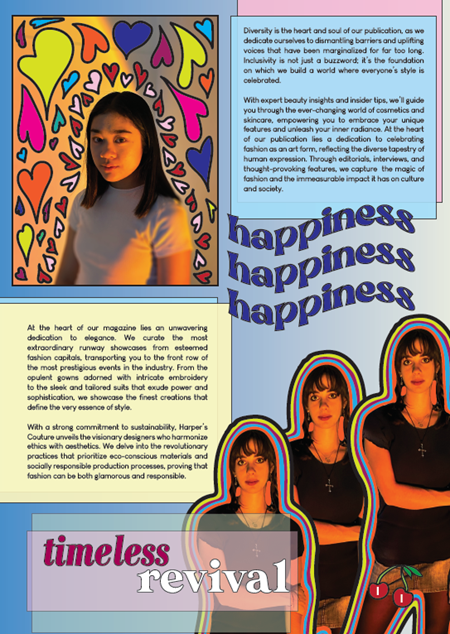My Multimedia Major Project is a fashion and art magazine. The main component is the magazine's striking allure and artistry through images and typography arrangement. However, it also includes articles surrounding these topics, alongside some lifestyle influence. A key point of inspiration for my magazine was the work of Wes Anderson, with strong cohesion in colour, symmetry and tone. I tried to create a cyclical nature of the magazine by beginning with a collage and ending with another one, with links to this in between and cohesive graphics and imaging throughout.